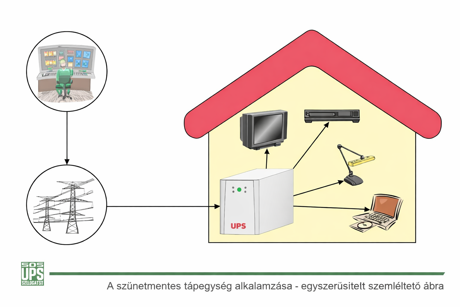 Az UPS az elektromos betáplálás meglétekor, képes annak bizonyos hibáit kivédeni; a hálózati feszültség kimaradása esetén pedig - amikor „áramszünet” van - saját akkumulátoráról, szünetmentesen biztosítani tudja a védendő fogyasztó megfelelő minőségű, meghatározott idejű áramellátását.